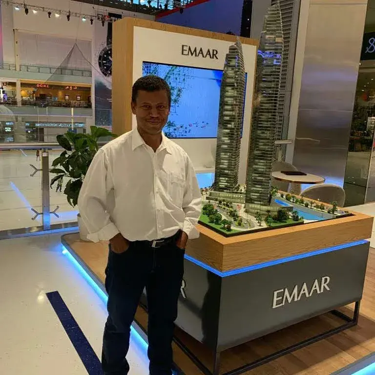 Photograph taken at the Emaar sales center in Dubai, showcasing a detailed architectural model of a landmark development. The environment represents high-end real estate strategy, innovation, and premium positioning within one of the most competitive property markets globally.